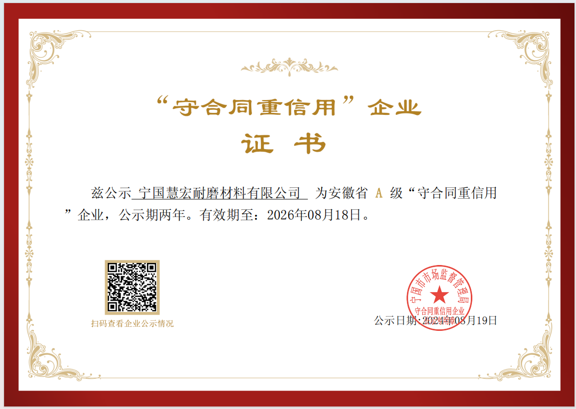 可靠的設(shè)備,才能長久穩(wěn)定運行全面推行ISO9001;2000版質(zhì)量管理體系標(biāo)準(zhǔn),秉承“科學(xué)管理、精心制造、優(yōu)質(zhì)服務(wù)、追求卓越”的質(zhì)量方針,不斷打造高端耐磨材料產(chǎn)品。